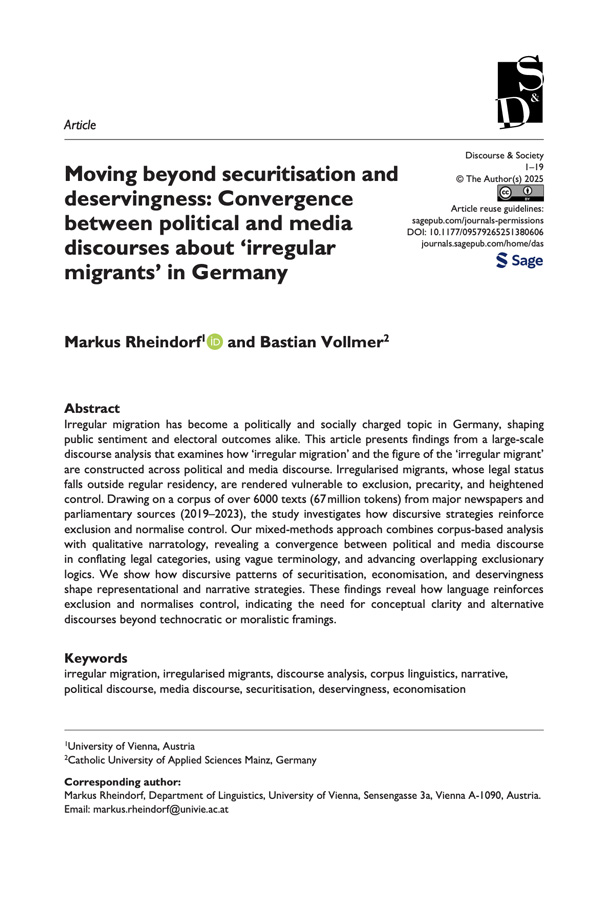 Rheindorf, M., & Vollmer, B. (2025). Moving beyond securitisation and deservingness: Convergence between political and media discourses about ‘irregular migrants’ in Germany. Discourse & Society. Article. I-CLAIM.